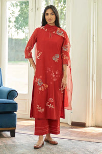The Poppy Floral applique Kurta Set features a vibrant hue, with floral thread work and applique detailing on the kurta and sleeves. Paired with matching pants and a flowing dupatta edged with floral applique and our signature tassels, this set brings a festive touch to every day.