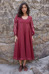 The Poppy Maroon Dress is a beautifully paneled design featuring hand-embroidered block pleated sleeves. This elegant dress combines structured styling with intricate detailing, offering a perfect balance of modern sophistication and timeless charm.
