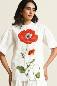 Designed with an exaggerated poppy motif, the shirt exudes a peasant style inspired look. Crafted out of cotton mul, the shirt features pin tuck details and hand stitches on the sleeves.