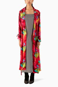The Poppy Trench Coat with Striped Slip Dress crafted from our stunning Vegan Silk fabrication, trans-seasonal, is a statement piece. Made in our blurry poppy print inspired by the hazy views of a poppy field, it is a two piece set. With contrast striped strappy slip, it is chic. The trench, Featuring a straight fit, this piece is unlined and has belt details on the sleeves. It also has a belt on the waist. Wear it with heels for an elegant look.