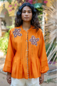 Featuring Popsicle Berlin Shirt from URAIB's collection Summer Lovin'. The product is made from 100% cotton chanderi highlighing the golden hand embroidered flowers along with detailed pleats in the front and intricate button detailing to give it a little edge.
