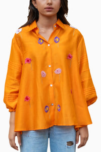 Featuring Popsicle Orange Scarlet Shirt by URAIB from The Colored Castle Collection. Luxuriously tailored in chanderi, this shirt captives with its machine embroidered front with multiple flower detailing, offering a sophisticated and statement-making addition to your wardrobe.