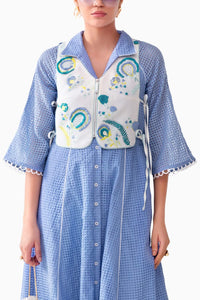 Introducing the Porto White Bubble Crepe Embroidered Half Jacket—a stylish layer that adds a touch of elegance to any outfit. This half jacket features intricate embroidery and playful side tie knots for a unique flair. The contrast stitch line details and front zipper enhance its contemporary look. With a regular fit, this jacket is perfect for transitioning between seasons while effortlessly elevating your style!