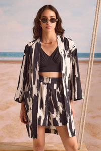 Turn heads with this chic three-piece Portofino Co-ord Set featuring a breezy open-front jacket, high-waisted shorts, and a sleek black bralette top. The bold monochrome abstract brushstroke print adds modern flair, perfect for beach days or city strolls. Complete the look with sunglasses, vibrant sandals, and minimal jewelry for a laid-back yet stylish vibe.