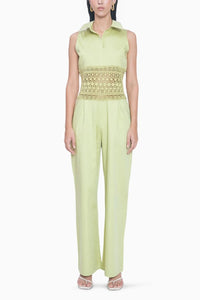 Featuring a structured shirt collar and a wide-legged silhouette, this sleeveless jumpsuit is designed in a slim fit with elegant lace detailing. A broad lace waistband adds definition, while a concealed back zip ensures a sleek, polished finish.