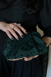 She’s abundant and her energy is infectious. She is - Pour It Up. Inherent with green silk velvet and encrusted tonal crystal beads all around - she’s a mesmeric outfit companion to any look. The undulating texture from the beads and pleating of the fabric add character and the signature Aomidori Shimai glimmer. It comes with a tonal velvet strap that doesn’t dig into the skin, and its lined interior fits every essential you need.