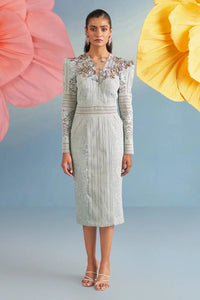In a soft powder blue, this bodycon silhouette is designed to accentuate the body with grace. Embellished with multicolored sequin roses that dance along the curves, it channels English-era elegance and Parisian charm — perfect for evening wear and formal occasions.