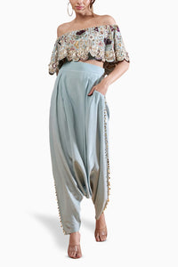 Featuring Powder Blue Crepe Embroidered Top with Pant by Payal Singhal. This chic ensemble showcases delicate embroidery and a relaxed silhouette, ideal for casual outings or stylish gatherings. Embrace comfort and modern flair effortlessly!