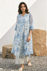 The Powder Blue Kurta Set blends grace and comfort, with soft floral prints and intricate pintuck details on the kurta. The asymmetric hem adds breezy charm, while striped pants complete the seamless look.