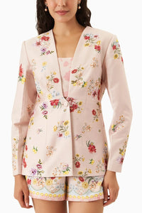 Featuring an intricately accented bustier, detailed shorts, and a signature-cut blazer, this Print Power Set makes a bold style statement with its striking design and confident silhouette.