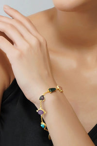 This delicate 22kt gold plated chain bracelet is made with 7 healing gemstones that are proven to infuse positivity, joy and abundance, and bring alignment of the chakras in our body. A BESTSELLER - the intimate bracelet is an effortless addition to everyday dressing. Stack with bracelets or your watch for a more eclectic look.