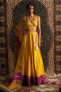 Perfect for any special occasion, this set exudes a regal presence, ensuring admiration wherever you go. The lehenga, adorned with exquisite tassels, sways gracefully, adding a sense of opulence and charm to the ensemble. Paired with a back tie up embroidered blouse, featuring intricate designs, the attire showcases rich artistry and timeless elegance. Completing the look is an organza dupatta, which adds an ethereal touch of beauty and sophistication, making this outfit a true statement of grace and luxury.