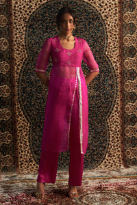 Elevate your style with this Rani Pink Kurta, blending timeless charm and modern sophistication. Crafted from luxurious chanderi, it features exquisite dabka and zari embroidery. The ethereal organza flare, adorned with intricate mirror and gota work, creates a graceful silhouette enhanced by a stylish front slit. Organza sleeves with delicate gota detailing add elegance, while sleek straight pants complete the look. Perfect for any celebration, this meticulously crafted kurta promises effortless elegance and a lasting impression.