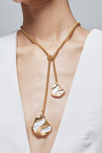This elegant neckpiece showcases a luminous white Mother of Pearl centerpiece, beautifully set on a hypoallergenic brass base. Its adjustable design ensures a perfect fit, combining sophistication with comfort for a stunning and versatile accessory.