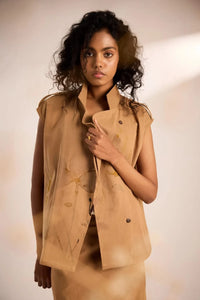 A beige twill cotton jacket with a subtle watercolor floral print. The tunic features a notch lapel collar and front button opening,. Featuring hand-painted floral motifs by our founder, Shilpi Yadav, thoughtfully translated into prints.