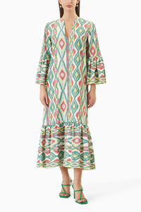 This tunic dress is inspired by traditional Chinese outfits. It is made of Uzbek silk Ikat.