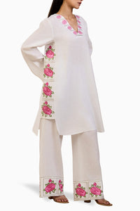 Primrose Co-ord Set: a symbol of summer sophistication. Crafted from pure, soft linen, it features intricate embroidery adorning the neck, side panels, and hemline. Effortlessly chic and breezy, this ensemble promises a touch of elegance for your summer.