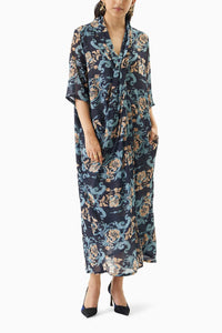 Featuring a printed multicoloured cowl pleated dress with two front pockets and back slit. This dress is crafted in organic vegetable dye fabric.