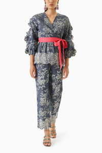 Featuring a contemporary yet chic vibe to your wardrobe with this co-ord set. This is made in printed denim with ruffles on the sleeves and broderie in the bottom hem. Contast pink cosmos wrap tie makes the blouse a stiking piece.The pants are also printed and cutwork embroidery at the bottom hem.