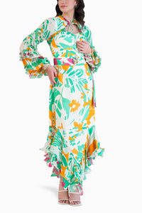 Featuring the Printed High Low Dress with Frilled Puff Sleeves and Constructed Yoke by Mandira Wirk's Waves of Love Collection. This charming mustard green floret printed chiffon dress features frilled puff sleeves, a neck tie, and a unique constructed yoke, perfect for adding a touch of whimsy to your wardrobe.