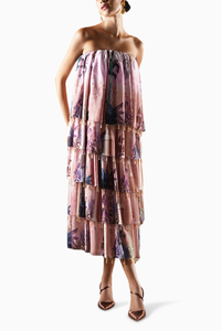 Featuring Printed Kara Dress by Mero's Edgy Arc collection. This multi-layered printed dress features flowing tiers and playful hangings, creating dynamic movement and a bold silhouette. A vibrant choice for those who love expressive, free-spirited fashion.