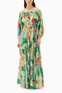 Redefine your charming look with this exclusive long dress. Cut in tropical printed chiffon fabric with off shoulder details. It assures a soft and soothing touch against the skin. Style this dress with statement jewelry.