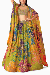 Enter the realm of exquisite elegance with the Green Printed Organza Waist Embellished Lehenga paired with an Embellished Bustier and Cape, a striking ensemble that merges traditional allure with contemporary flair. Crafted from luxurious organza, the lehenga features intricate prints in vibrant green hues, showcasing a blend of sophistication and cultural richness. The Embellished Bustier complements the lehenga with its detailed craftsmanship, enhancing the waistline and adding a touch of modern glamour.