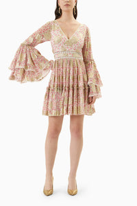 Crafted in lurex georgette fabric this white and pink printed short dress is framed with a deep v-neckline which meets at the fitted waistline and features bell sleeves with lace trims to create a flattering feminine silhouette.
