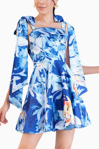 Featuring the Printed Short Dress with Knotted Straps by Mandira Wirk's Waves of Love Collection. This botanical foliage-printed satin dress features charming knotted straps and delicate lace detailing, offering a playful yet elegant look in vibrant blue, perfect for any summer outing.