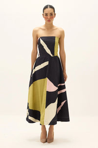 A strapless midi dress in cotton poplin featuring bold, abstract colour blocks in olive, blush, and cream. The fitted bodice flows into a voluminous skirt, finished with smocking at the back for comfort and structure.
