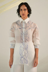 Featuring a sheer white shirt in viscose organza, this piece is defined by bold blue PVC cord linework tracing graphic contours. An open front placket pairs with a structured collar, while full-length sleeves echo the design with matching cuff detailing.