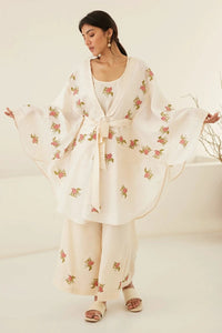 Featuring Pristine White Kimono Set by Cotton and Clay, a graceful ensemble crafted in hand block printed Chanderi. The set includes a kimono top with delicate French knot detailing, a sleeveless inner top, and flared hem trousers—effortlessly blending elegance and comfort in serene white sophistication.
