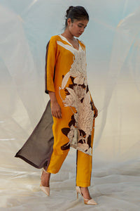A simple V neck high low kurta with our statement print in the front based on yellow with a plain brown back.