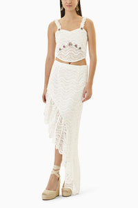 Adorned with glass beads and decorated with guipure lace, the sensual Puerto Co-Ord Set features a bustier- bralette top with adjustable back, ruffled strap detail and high low ruffle skirt with zipped closure which can make any girl feel like a dream.