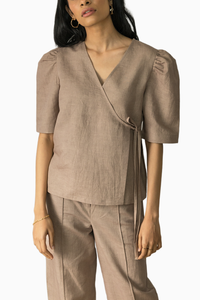 We paid special attention to silhouette when designing this top – it's shaped with gathered puffed sleeves, v-neck and has a delicate wrap with ties to highlight the waist. It can be dressed up or down depending on the occasion.
