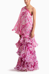 Turn heads in our Purple Chiffon Off-Shoulder Layered Dress. Featuring delicate faded floral embroidery and four cascading layers, it's a graceful and captivating choice for any special occasion.