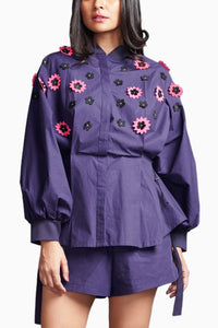 Featuring Purple Confetti Detailed Co-Ord Set by Deepika Arora. A pleated confetti detailed shirt and shorts set