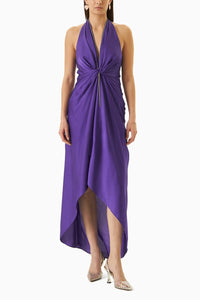 Halterneck Satin drape dress,Chain detailing on neckline and hanging in center front, Front under skirt  lining, back drape till hips, Center back conceal zipper, Back less. Anckle length dress.