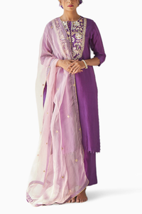 Featuring a silk chanderi purple embroidered kurta with pants, it comes along with a blush pink dupatta with small motifs.
