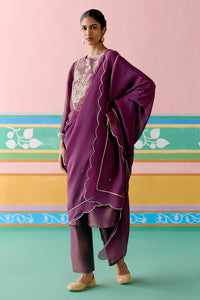 Opulent and refined, the Purple Embroidered Kurta Set is crafted in luminous Tissue with an intricately embroidered yoke featuring metallic handwork and zari. Paired with elasticated pants for a regal festive look.
