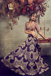 Featuring purple embroidered lehenga paired with contrasting red embroidered blouse. The set is crafted with the finest materials and will accentuate the look.