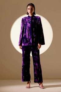 Featuring the Purple Enchanté Cape and Pants Set by ANAHE, this exquisite ensemble includes an embroidered cape paired with matching pants. The intricate detailing and bold purple hue create a captivating look, blending elegance and contemporary style effortlessly.