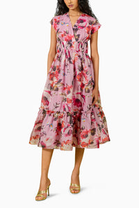 This Purple Floral V-Neck Dress in organza features an overlapping bodice, gathered band waist, extended collar, and delicate frill detailing. Feminine and contemporary, its elegant silhouette makes it perfect for brunch dates or stylish daytime occasions, combining charm with effortless sophistication.