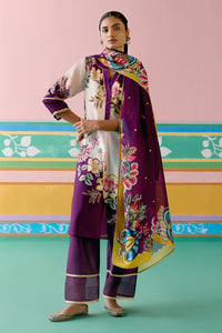 Elegant yet contemporary, the Purple Floral V-neck Kurta Set is crafted in airy Chanderi with delicate organza detailing and lace inserts on the neckline and sleeves. Fine pintucks add texture, while elasticated pants and an organza dupatta with full lace border offer comfort and understated glamour.