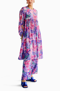 Featuring a printed kurta with gather detailing with same printed pants, tailored in cotton silk.