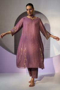 Featuring Purple Husna Kurta Set by Sarang Kaur by Mansa Collection. This set showcases chanderi silk Kurta and pants in a regal purple hue, blending traditional craftsmanship with contemporary style for a graceful and sophisticated look on any occasion.