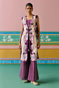 Chic and contemporary, the Purple Ikkat Jacket Set is crafted in airy Chanderi with a sleeveless jacket featuring a full lace border and playful dori tie-ups with tassels. Paired with a smocked-back bralette and elasticated pants, it blends ease and elegance for festive celebrations.