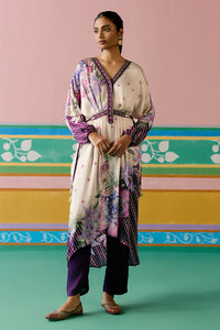 Effortlessly elegant, the Purple Ikkat Kaftan Set is crafted in fluid Viscose Satin Georgette with hand-embroidered gota patti on the neckline and waistband. Dori tie-ups with tassels, elasticated sleeves, and pants ensure comfort—striking the perfect balance of ease and grandeur for festive celebrations.