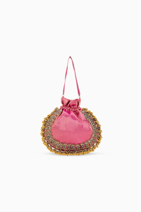 Featuring the Pink Leander Potli by 5 Elements by Radhika Gupta. A chic accessory blending simplicity and elegance, crafted with finesse. Its plain design showcases timeless style, while the metallic moor detailing adds sophistication, making it perfect for any occasion, seamlessly merging tradition with contemporary fashion.