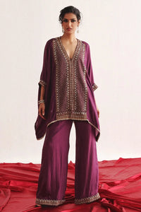 The Purple Marodiwork Ankle Length Palazzo Pants from the Rangrez collection by 29 India are a sophisticated and elegant choice for any occasion. Rendered in a rich purple hue, these palazzos feature exquisite Marodiwork embroidery, adding a touch of luxury and fine craftsmanship. Crafted from luxurious Silk, the ankle-length design offers a graceful silhouette, while the tailored fit ensures a flattering and refined look. Designed to exude grace and sophistication, these palazzos are the perfect complement to any ensemble, making a bold yet elegant statement.